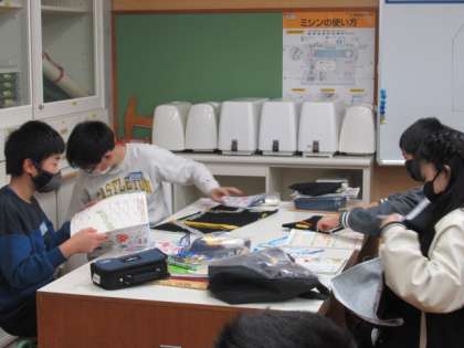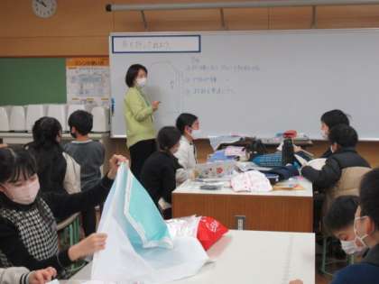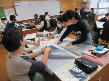 エプロンづくりに挑戦しています。大きな布を示された線で折り、アイロンをかけて整え、まち針を垂直にうっていきます。「生活に役立つ物」を作る学習は、子供たちの意欲をおおいに喚起しますね。