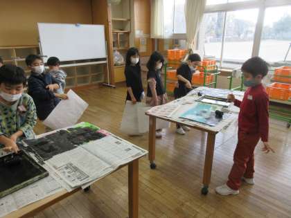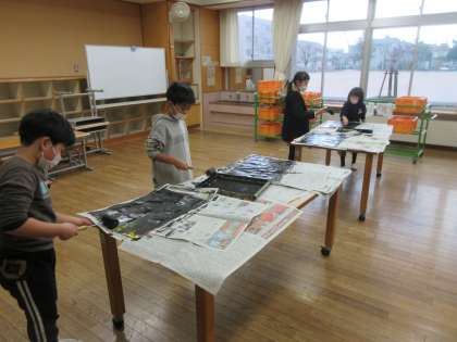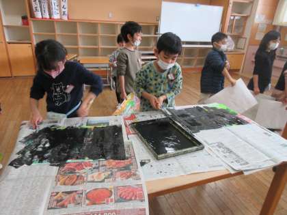 今日の図工では、ついに、シールを貼った絵の上から黒色をローラーで塗りました。絵は真っ黒になりましたが、シールをはがすとすてきな世界が広がっているはず!!とても楽しみですね。
