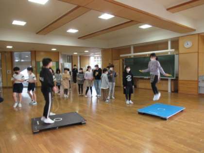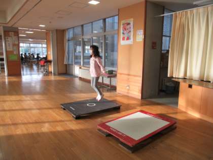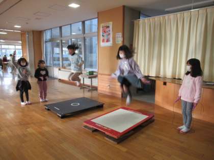 各階の多目的教室には、ジャンピングボードを置き、二重跳びの練習をできるようにしています。