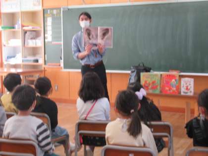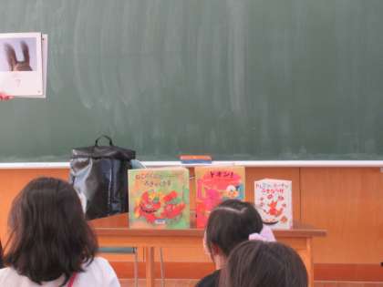 市立図書館より2名おいでいただき、読み聞かせや本の紹介をしていただきました。さすが専門家の語りです。子供たちはあっという間に本の世界に引き込まれていました。