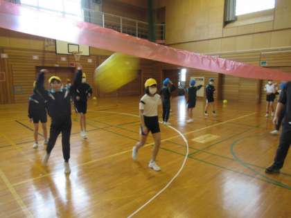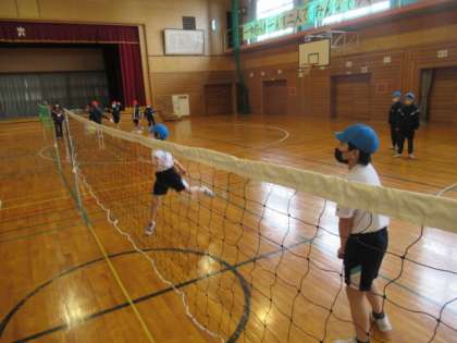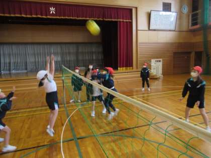 ネットを張り、間をタフロンテープでつなぎ、体育館のフロアをめいっぱいに使ってゲームをしました。4年生でも無理なくボールを扱うことができるようなルールにしてあるため、子供たちは安心して取り組んでいます。