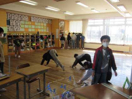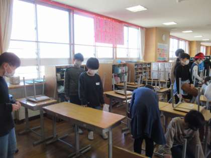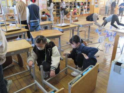 放課後のワックスがけに備えて、床の水拭きをしました。気付いた子は、机や椅子の脚の浦もきれいにしてくれました。ありがとう。