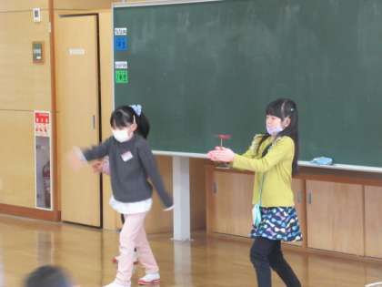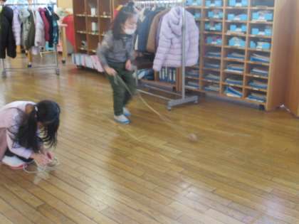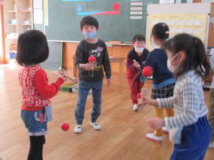 おはじき、こま、けん玉、竹とんぼ、それぞれ名人を目指してがんばっています。