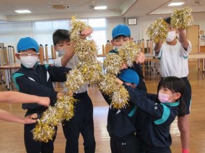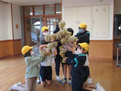 卒業を祝う集会の練習です。演技の最後にポンポンで文字をつくります。