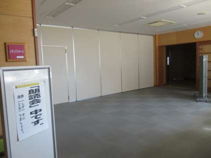 朗読会では環境つくりが大切です。室外からの様々な音が入り込むことがないよう、今回は会場である会議室を写真のようにパーテーションで完全に仕切ってみました。白い壁の向こう側のお部屋で、今、朗読会が行われています。きっとすてきな時間になっていることでしょう。