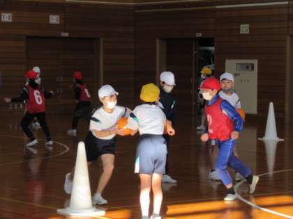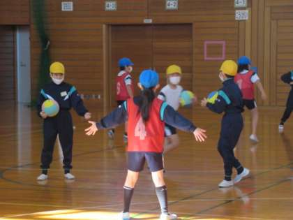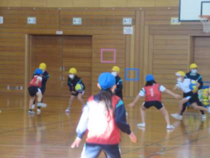 タグラグビーの導入的なボール運動として取り組んでいます。子供たちは、すばやい動きをしながらポジションの工夫をしています。