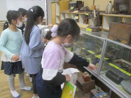 社会科の学習では、昔の道具について学んでいます。学校にある昔の道具を見て、現在の何なのか予想しました。