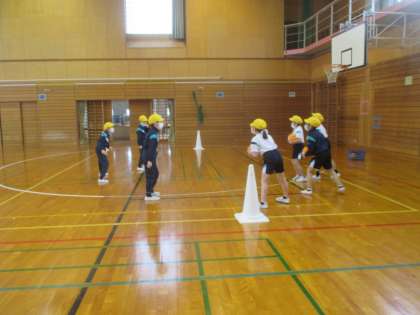 体育科の学習では、宝運びゲームに取り組んでいます。攻めは守りにタッチされないように、ボールをゴールまで運ばなくてはなりません。団で作戦を立てて、多くの宝を運べるようにがんばっています。