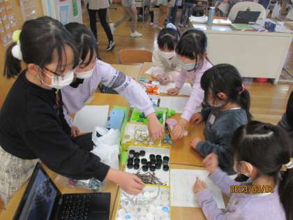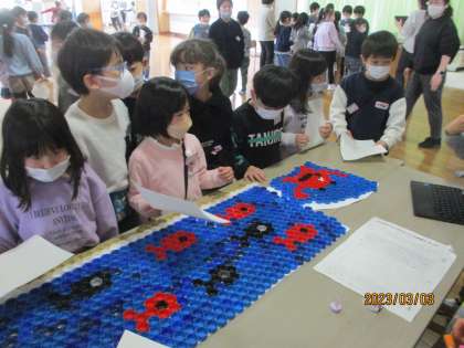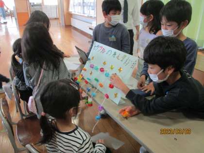 3年生は、総合的な学習の時間に学んだことを活かして、ペットボトルのキャップでおもちゃや遊び、飾りを作り、「エコキャップフェスティバル」を開催しています。