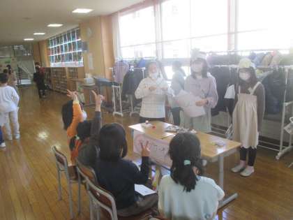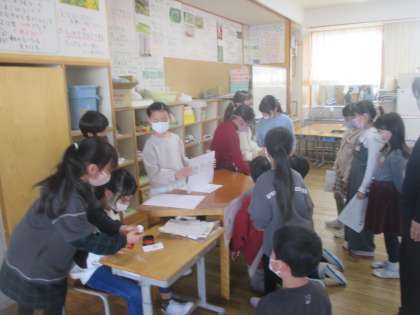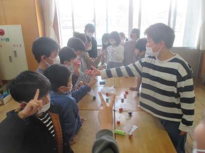 3年生が総合的な学習で学んだことを、2年生にもお裾分けしていただきました。エコキャップを使った遊びで遊んだり、飾りを紹介してもらったりして目を輝かせ感動する2年生でした。