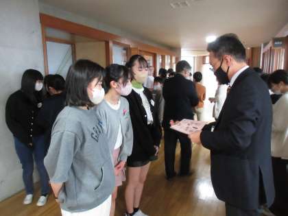 朝の時間に、6年生が教職員に感謝の手紙を渡しに来てくれました。