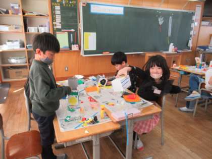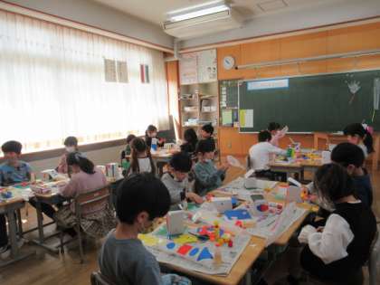 1年生では、またまた楽しい製作活動に取り組んでいます。自分の願いに合わせて楽しい箱をつくり上げます。色紙を折ったり切ったりしながら、製作に熱中しています。