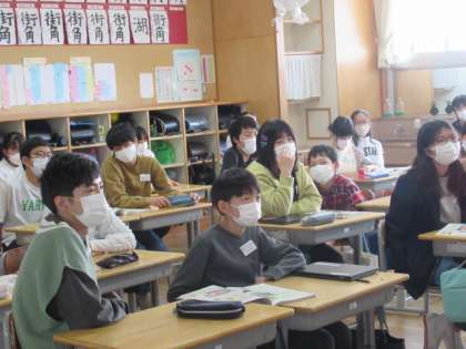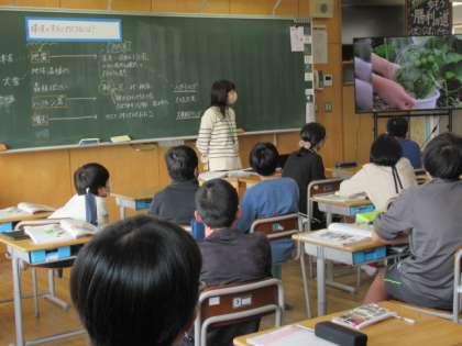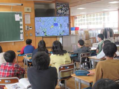 理科の学習では、大型モニターで動画を見ながら進めました。子供たちがこれまでやってきたことも紹介され、子供たちも反応しながら見ていました。