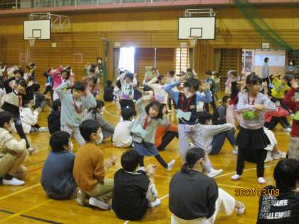 昨日、6年生の卒業を祝う集会がありました。1年生は、これまで毎日練習してきた「ジャンボリーミッキー」を披露しました。