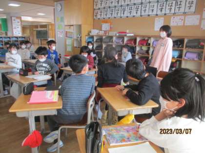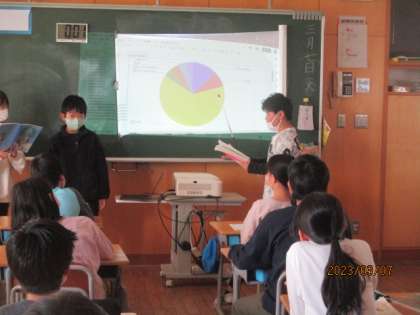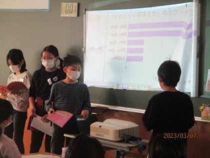 国語科の学習では、私たちの身のまわりのことをグラフにして発表しました。子供たちは互いの生活のことについてアンケートをとり、分かりやすくまとめることができました。(写真は3月7日撮影のものです)