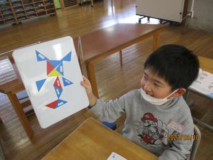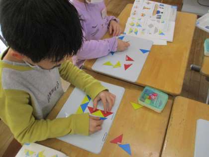 算数科の学習では、かたちの学習をしています。色板を使って、教科書の絵と同じ形をつくったり、自由に並べて形をつくったりしました。友達と見合いながら、楽しく学習しています。