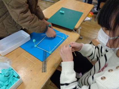 算数科では、「はこの形」を学習しています。辺や頂点の数を調べながら組み立てました。