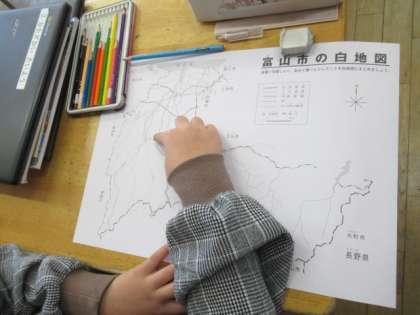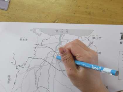 富山市の白地図を使って学習しました。まずは川の位置から。神通川を指で辿り、色鉛筆で彩色しました。