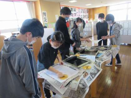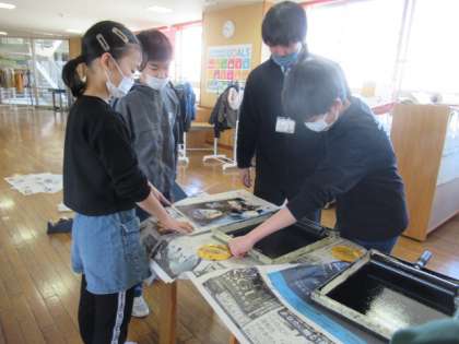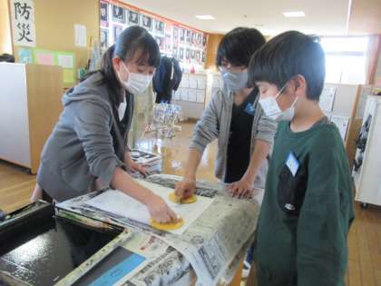 彫り終わり、いよいよインクを使って刷り上げます。慎重に作業を進めています。