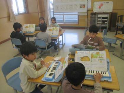 音楽科「みんなであわせてたのしもう」では、「こぐまの二月」を鍵盤ハーモニカで練習しています。3つの旋律をグループで合わせて音楽を作っています。グループの仲間の音をよく聞きながら弾くのが上手になってきている子供たちです。