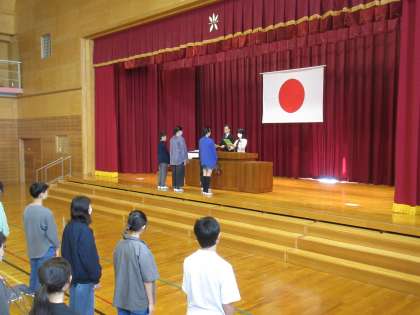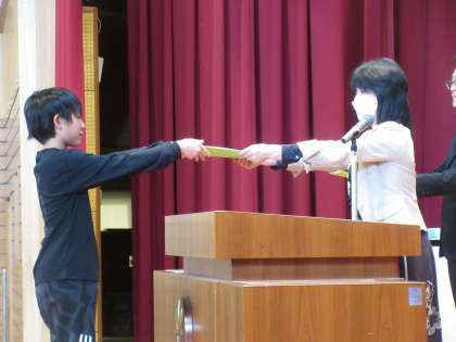 修了証授与式を行い、代表の4名が校長先生から修了証を受け取りました。