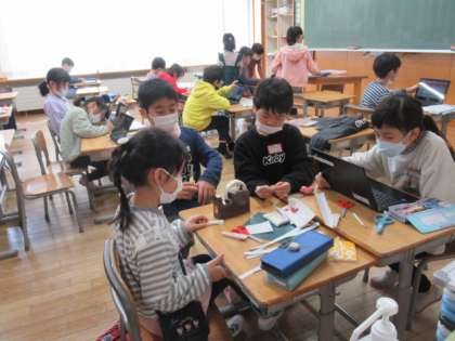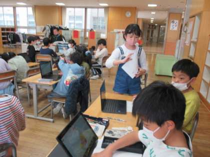 近頃は、学級活動の時間にもクロームブックが大活躍です。話し合っている様子は、なんだか大人の企画会議のようにも見えます。