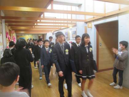 いままでたくさんお世話になった6年生の晴れ姿や仲間の門出の言葉を観て、お祝いの気持を高めたり、次の学年でも頑張ろうという思いをもったりしました。