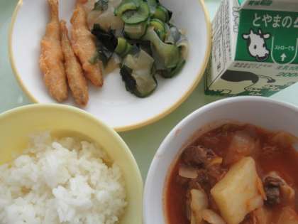 給食では、こんにゃくは煮物に入れることが多いのですが、今日はサラダにしてみました。