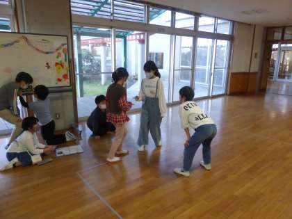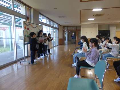 今年度も終わりに近付いてきました。3年生は各クラスでお楽しみ会の計画を立てています。今日は、1組がお楽しみ会を開きました。写真は、「始めの言葉」と、白熱の「色団対抗Sの字じゃんけん」の様子です。