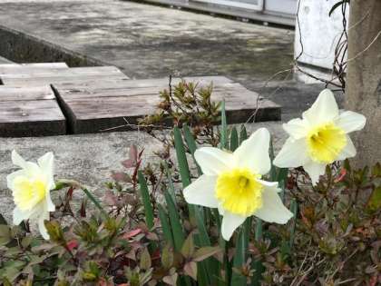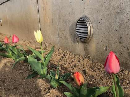 おはようございます。光陽小学校のあちこちに春を告げています。にこさわ広場では、これから咲き始めるチューリップのプランタをセッティングしました。グラウンド側は南向きで日当たりがよいため、既に赤色のチューリップは満開です。しかし、なぜ赤色のものだけが?