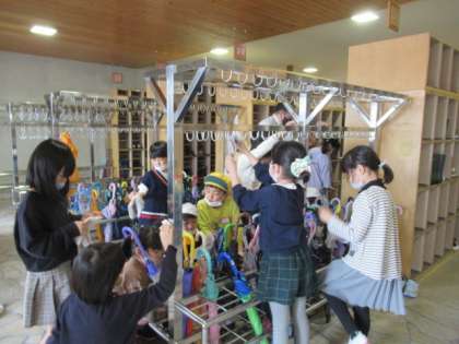 学活後は、お掃除をしました。まず、玄関の靴箱をきれいにしました。雑巾で拭き上げ、次の学年のお友達に渡します。