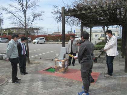 防災井戸が完成し、富山市防災危機管理課の担当の方、設置してくださった会社の方、そして自治振興会の会長さん・副会長さん立ち会いのもとで、説明会を行いました。