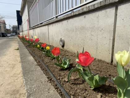 チューリップが元気に咲いています。赤色の他に黄色の花も。