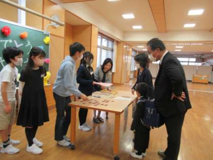 1年生の子供たちがおうちの方といっしょに登校してきました。受付では、6年生が笑顔で1年生をお迎えし、教室まで案内しました。1年生の子供たちは、大きな校舎にさすがにちょっと緊張気味の様子です。