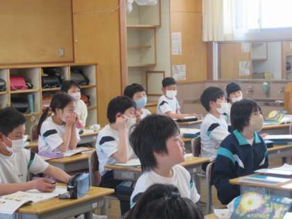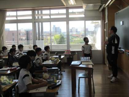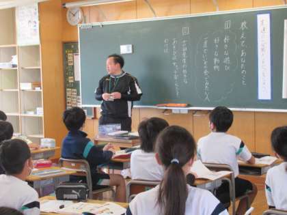 「教えて、あなたのこと」の学習です。インタビューの内容を先生からお手本を示し、その後各自で考えていきました。まず「やってみせる」、その上で子供たちが自分の力で取り組んでいきます。