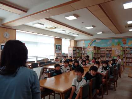 図書館オリエンテーションがありました。図書室での約束や、本の貸し借りの仕方を改めて確認しました。内履きもしっかりそろえて中に入ります。