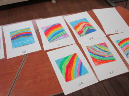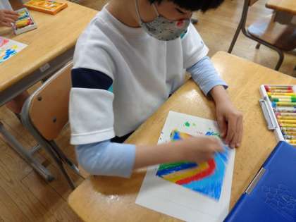 図画工作科の時間に、自分が思い描く「にじ」をクレヨンで描きました。学級目標の周りに掲示する予定です。