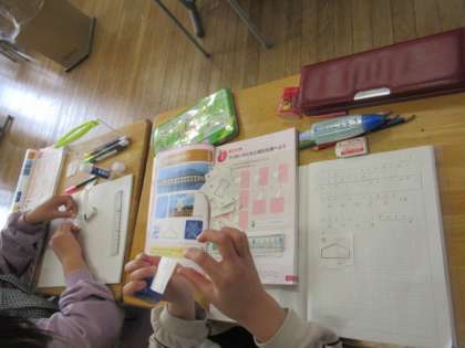 たくさんの形があります。それらを形の特徴に目を付けて仲間分けしていきました。具体的に作業することで、理解は定着しやすくなりますね。