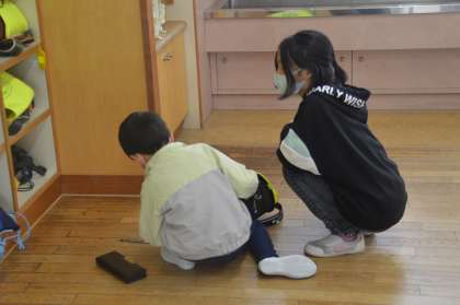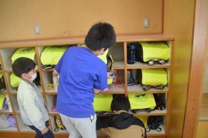 朝の準備や掃除の時間に1年生のお手伝いに行っています。1年生の目線に合わせて話したり、「分からないことはある?」と優しく話しかけたりする子供たちです。