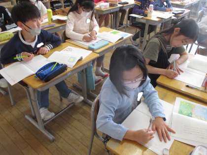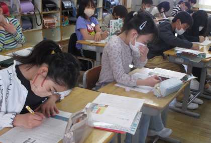 物語から感じたことや考えたことを、一生懸命ノートに書く子供たちです。