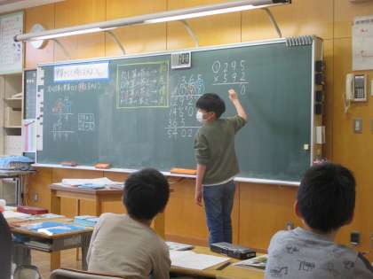 3年生よりさらにレベルアップした「3位数×3位数」の計算に一生懸命取り組む子供たちです。