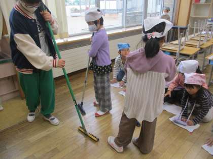 ぞうきんがけやほうき等役割を決めて掃除を頑張っています。今日は、黒板や洗面所の掃除の仕方を勉強しました。6年生と一緒に取り組んでいます!