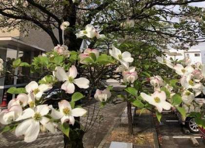久しぶりの青空の朝です。光陽小学校の敷地にはたくさんの花が見られ、気持ちがよいです。