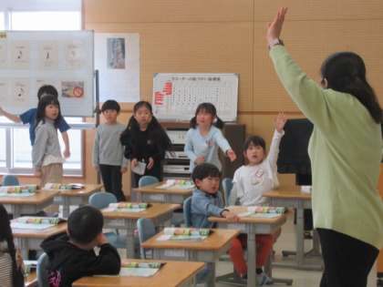 「かくれんぼ」を歌いながら、旋律に合わせて体を動かします。子供たちはノリノリで楽しんでいます。リズム感や音感は実際に体験することで、有効に身に付いていきます。