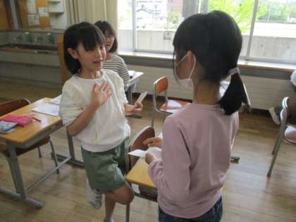 外国語活動では、世界の国の名前や挨拶を言ったり、英語で自己紹介をしたりしました。