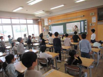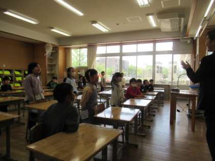 「うたにあわせてあいうえお」をみんなで音読しました。そのあと、各クラスで考えたオリジナルの「あいうえお」を音読しました。声を合わせて元気に音読できました。