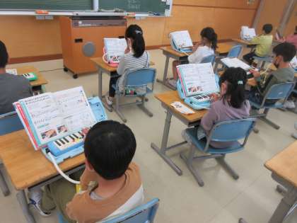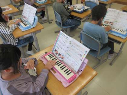 音楽科の学習で鍵盤ハーモニカで演奏をしました。指くぐりや指またぎの練習を何度も繰り返し、なめらかに演奏できるようになりました。
