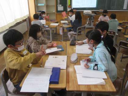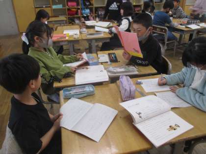 「きつつきの商売」は2場面まであります。今日は、その続きの3の場面を考えてみました。子供たちは登場人物や、どんな音を売ってどんな出来事があったのかなどを考え、グループで紹介しました。