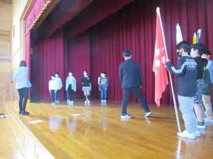 明日は運動会の結団式を予定しています。団リーダーの子供たちは、式のリハーサルに朝から励んでいます。