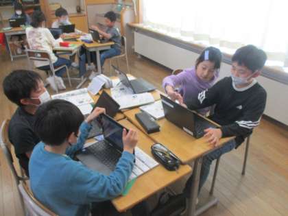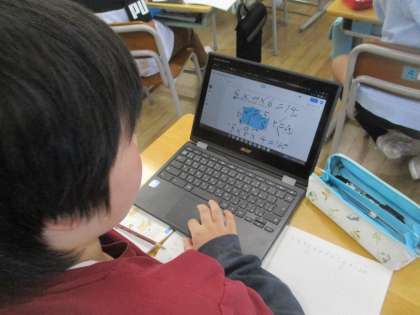5年生の算数では体積について学習しています。クロームブックを活用しながら、どのようにしたら、変わった形の立体の体積を求められるのか考えました。